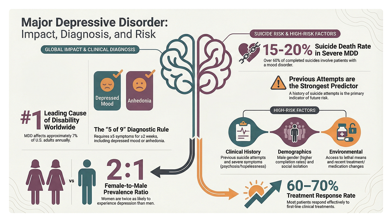 A clear and compassionate visual overview of Major Depressive Disorder, highlighting key symptoms, causes, and treatment options. Designed to help individuals and families better understand the condition and recognize when to seek professional support.